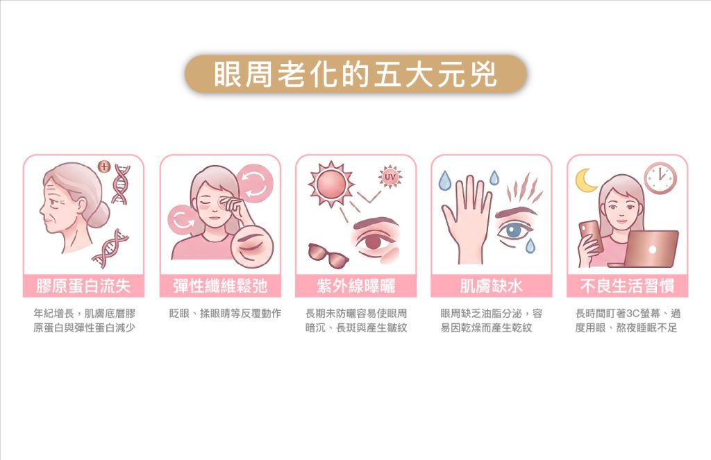 ・紫外線曝曬: 光老化是破壞膠原蛋白的隱形殺手,長期未防曬容易使眼周暗沉、長斑與產生皺紋。